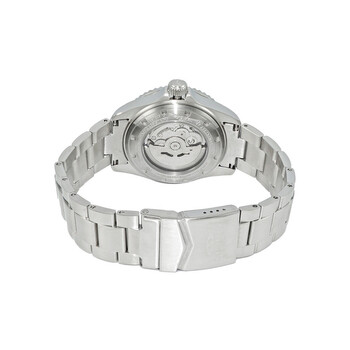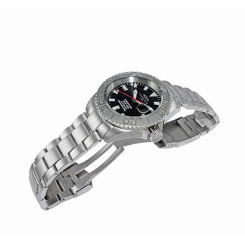 Silver-tone stainless steel case and bracelet. Uni-directional rotating silver-tone stainless steel bezel. Black dial with silver-tone sword-shaped hands and index hour markers. Minute scale around the inner rim. Dial Type: Analog. Luminescent hands and markers. Magnified date display at the 3 o'clock position. SII Caliber NH35A Automatic movement, containing 24 Jewels, bitting at 21600 vph, and has a power reserve of approximately 41 hours. Scratch resistant mineral crystal. Screw down crown. Transparent case back. Round case shape, case size: 45 mm, case thickness: 13.62 mm. Band width: 21 mm, band length: 7.25 inches. Fold over clasp with a safety release. Water resistant at 200 meters / 660 feet. Functions: date, hour, minute, second. On05515 Series. Casual watch style. Watch label: Japan Movt. Oniss Automatic Black Dial Men's Watch ON5515-11-BK.