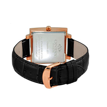 Rose gold-tone stainless steel case with a black leather strap. Fixed rose gold-tone bezel. Black dial with luminous rose gold-tone hands and index hour markers. Minute markers around the outer rim. Dial Type: Analog. Luminescent hands. Date display at the 3 o'clock position. Quartz movement. Scratch resistant mineral crystal. Pull / push crown. Solid case back. Square case shape. Case size: 42 mm. Case thickness: 13 mm. Band width: 22 mm. Band length: 8.25 inches. Buckle clasp. Water resistant at 30 meters / 100 feet. Functions: date, hour, minute, second. Casual watch style. Watch label: Japan Movt. Oniss ON4444 Black Dial Men's Watch ONJ4444-0RGBK.