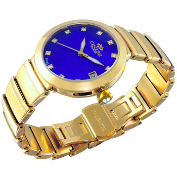 Gold-tone stainless steel case with a gold-tone stainless steel bracelet. Fixed gold-tone stainless steel bezel. Blue dial with gold-tone hands and index hour markers. Dial Type: Analog. Luminescent hands. Date display at the 3 o'clock position. Quartz movement. Scratch resistant mineral crystal. Pull / push crown. Solid case back. Round case shape, case size: 33 mm, case thickness: 10 mm. Band width: 16 mm, band length: 6.375 inches. Deployment with push button release clasp. Water resistant at 50 meters / 165 feet. Functions: date, hour, minute, second. Dress watch style. Watch label: Swiss Movt. Oniss ON5559SS Quartz Blue Dial Ladies Watch ON5559SSGBU.