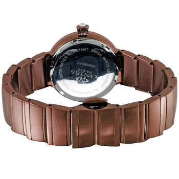 Brown stainless steel case with a bronze stainless steel bracelet. Fixed brown stainless steel bezel. Brown dial with rose gold-tone hands and index hour markers. Dial Type: Analog. Luminescent hands. Date display at the 3 o'clock position. Quartz movement. Scratch resistant mineral crystal. Pull / push crown. Solid case back. Round case shape, case size: 33 mm, case thickness: 10 mm. Band width: 16 mm, band length: 6.375 inches. Deployment with push button release clasp. Water resistant at 50 meters / 165 feet. Functions: date, hour, minute, second. Casual watch style. Watch label: Swiss Movt. Oniss ON5559SS Quartz Brown Dial Ladies Watch ON5559SSIPBN.