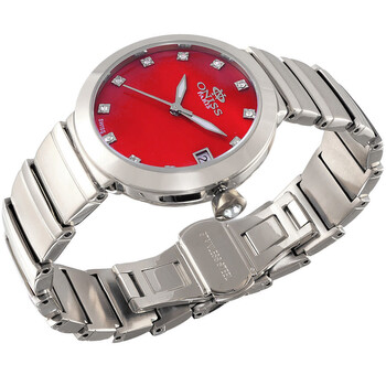 Stainless steel case with a stainless steel bracelet. Fixed stainless steel bezel. Red dial with luminous silver-tone hands and crystal hour markers. Dial Type: Analog. Luminescent hands. Date display at the 3 o'clock position. Quartz movement. Scratch resistant mineral crystal. Pull / push crown. Solid case back. Round case shape. Case size: 33 mm. Case thickness: 10 mm. Band width: 16 mm. Band length: 6.375 inches. Deployment clasp with a push button release. Water resistant at 50 meters / 165 feet. Functions: date, hour, minute, second. Dress watch style. Watch label: Swiss Movt. Oniss ON5559SS Quartz Red Dial Ladies Watch ON5559SSLRD.