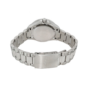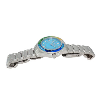 Silver-tone stainless steel case with a silver-tone stainless steel bracelet. Fixed multicolor crystal set bezel. Blue dial with silver-tone hands and index hour markers. Minute markers around the outer rim. Dial Type: Analog. Luminescent hands and markers. Date display at the 3 o'clock position. Quartz movement. Scratch resistant mineral crystal. Pull / push crown. Solid case back. Round case shape, case size: 36 mm, case thickness: 11 mm. Band width: 18 mm, band length: 6.5 inches. Fold over with safety release clasp. Water resistant at 30 meters / 100 feet. Functions: date, hour, minute, second. Dress watch style. Watch label: Swiss Movt. Oniss ON7323 BlueDial Ladies Watch ONJ7323-070BU-BUSC.