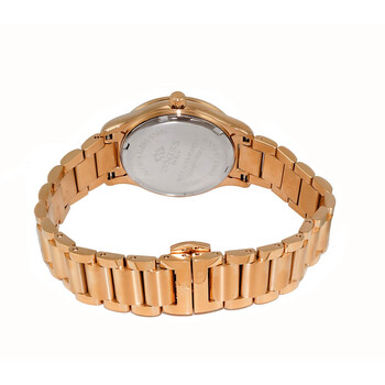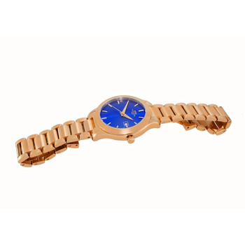 Rose gold-tone stainless steel case with a rose gold-tone stainless steel bracelet. Fixed rose gold-tone stainless steel bezel. Blue dial with rose gold-tone hands and index hour markers. Dial Type: Analog. Luminescent hands and markers. Date display at the 3 o'clock position. Quartz movement. Scratch resistant mineral crystal. Pull / push crown. Solid case back. Round case shape, case size: 33 mm, case thickness: 9 mm. Band width: 16 mm, band length: 6.75 inches. Deployment with push button release clasp. Water resistant at 50 meters / 165 feet. Functions: date, hour, minute, second. Casual watch style. Watch label: Swiss Movt. Oniss ONJ4441 BlueDial Ladies Watch ONJ4441-0LRGBU.