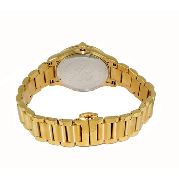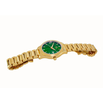 Yellow gold-tone stainless steel case and bracelet. Fixed yellow gold-tone bezel. Green dial with luminous yellow gold-tone hands and index hour markers. Dial Type: Analog. Luminescent hands and markers. Date display at the 3 o'clock position. Quartz movement. Scratch resistant mineral crystal. Pull / push crown. Solid case back. Round case shape. Case size: 33 mm. Case thickness: 9 mm. Band width: 16 mm. Band length: 6.75 inches. Deployment with push button release clasp. Water resistant at 50 meters / 165 feet. Functions: date, hour, minute, second. Onj4441 Series. Casual watch style. Watch label: Swiss Movt. Oniss ONJ4441 Green Dial Yellow Gold-tone Ladies Watch ONJ4441-0LGGN.