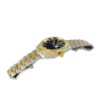 Men's Watch, 2-tone Gold All Stainless Steel Case an Band, w/ Fold-over deployment w/ safety clasp , Sunray Black Dial, with Day-Date Display, Accented with Austrian Crystal, Gold tone with luminous hour indicator hour and second hand. Screw-down Crown, Mineral Crystal