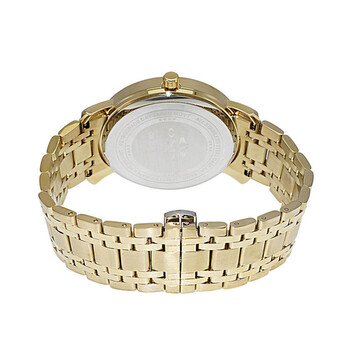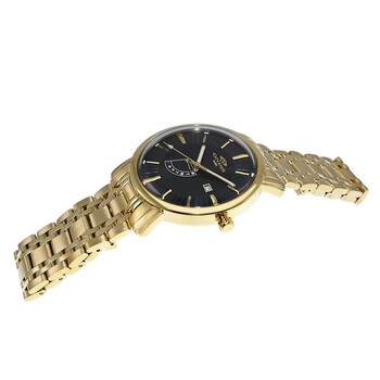 Yellow gold-tone stainless steel case and bracelet. Fixed yellow gold-tone stainless steel bezel. Black dial with yellow gold-tone hands and index hour markers. Minute markers around the outer rim. Dial Type: Analog. Luminescent hands. Day / date. VX46E quartz movement. Scratch resistant acrylic crystal. Pull / push crown. Solid case back. Round case shape, case size: 44.0 mm, case thickness: 13.5 mm. Band width: 24.0 mm, band length: 7.0 inches. Fold over with double push button release clasp. Water resistant at 3 meters / 10 feet. Functions: date, day, hour, minute, second. Sorrento Series. Casual watch style. Watch label: Japan Movt. Oniss Sorrento Quartz Black Dial Men's Watch ON2626-MGBK.