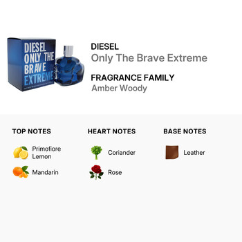 Belonging to the Amber Woody fragrance family, Only The Brave Extreme opens with a burst of fresh Primofiore lemon and juicy mandarin. These vibrant top notes create an energizing first impression that instantly grabs attention. As the scent develops, heart notes of warm coriander and romantic rose add a spicy yet refined edge, giving the fragrance a unique and balanced character.