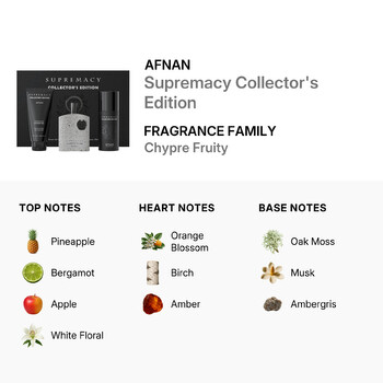 Launch year: 2024. Fragrance Family: Chypre Fruity. Top notes: Pineapple, Bergamot, Apple, White floral. Heart notes: Orange blossom, Birch, Amber. Base notes: Oak moss, Musk, Ambergris. Design house: Afnan. Design house category: middle eastern fragrance. Design house country: United Arab Emirates. Scent name: Supremacy Collector's Edition. Gender: Mens. Category: Fragrance. SubType: Gift Set. Barcode: 6290171077183. Set Includes: Collector's Edition 100ml + Deodorant Spray 150ml +Shower Gel 150ml. Afnan Men's Supremacy Collector's Edition Gift Set Fragrances 6290171077183.