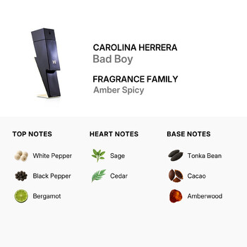 Launch year: 2019. Fragrance Family: Amber Spicy. Top notes: White pepper, Black pepper, Bergamot. Heart notes: Sage, Cedar. Base notes: Tonka bean, Cacao, Amberwood. Design house: Carolina Herrera. Design house category: fashion. Scent name: Bad Boy. Gender: Mens. Category: Fragrance. SubType: EDT Spray. Size: 3.4 oz. Barcode: 8411061923245. Bad Boy / Carolina Herrera EDT Spray 3.4 oz (100 ml) (m).