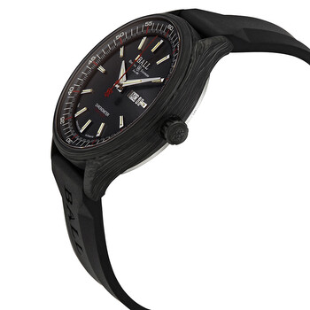 Black mumetal and carbide composite case with a black rubber strap. Fixed black mumetal and carbide composite bezel. Black dial with luminous silver-tone hands and index hour markers. Minute markers. 60 second markers around the outer rim. Dial Type: Analog. Luminescent hands and markers. Day of the week and date display at the 3 o'clock position. Ball calibre RR1102-C automatic movement, based upon ETA 2836-2, containing 25 Jewels, bitting at 28800 vph, and has a power reserve of approximately 38 hours. Scratch resistant sapphire crystal. Screw down crown. Solid case back. Round case shape. Case size: 45 mm. Case thickness: 12.4 mm. Band width: 22 mm. Tang clasp. Water resistant at 100 meters / 330 feet. Functions: date, day, hour, minute, second, chronometer, shock resistant, magnetic resistant. Engineer II Series. Casual watch style. Watch label: Swiss Made. Ball Engineer II Automatic Chronometer Black Dial Men's Watch NM3060C-PCJ-GY.