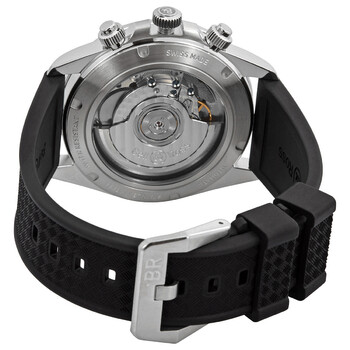 Stainless steel case with a black rubber strap. Fixed stainless steel bezel with an inlaid black aluminum ring showing 60 minute markings. Black dial with luminous silver-tone hands and index hour markers. Arabic numerals appear at the 6 and 12 o'clock positions. Minute markers around the outer rim. Dial Type: Analog. Luminescent hands - superluminova. Date display between the 4 and 5 o'clock positions. Chronograph - two sub-dials displaying: 60 second and 30 minute. Bell and Ross calibre BR-CAL.301 automatic movement, based upon ETA 2894-2, containing 37 Jewels, bitting at 28800 vph, and has a power reserve of approximately 42 hours. Scratch resistant sapphire crystal. Screw down crown. Transparent case back. Round case shape. Case size: 41 mm. Band length: 7 inches. Tang clasp. Water resistant at 100 meters / 330 feet. Functions: chronograph, date, hour, minute, small second. Vintage V2-94 Aeronavale Series. Luxury watch style. Watch label: Swiss Made. Bell and Ross Vintage V2-94 Aeronavale Chronograph Automatic Black Dial Men's Watch BRV294-HER-ST/SRB.