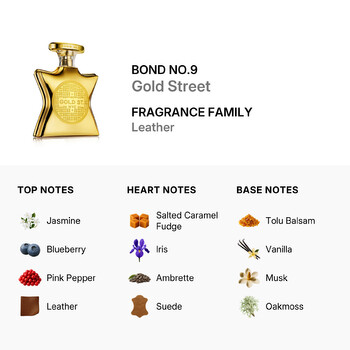 Launch year: 2024. Top notes: Jasmine, Blueberry, Pink Pepper and Leather. Heart notes: Salted Caramel Fudge, Iris, Ambrette and Suede. Base notes: Tolu Balsam, Vanilla, Musk and Oakmoss. Design house: Bond No.9. Scent name: Gold Street. Gender: Unisex. Category: Fragrance. SubType: EDP Spray. Size: 3.3 oz. Barcode: 888874008502. Bond No.9 Unisex Gold Street EDP Spray 3.3 oz Fragrances 888874008502.