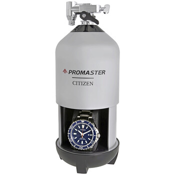 Stainless steel case with a stainless steel bracelet. Uni-directional rotating stainless steel bezel with a blue aluminum ring. Blue dial with luminous silver-tone hands and index hour markers. Minute markers around the outer rim. Dial Type: Analog. Luminescent hands and markers. Date display at the 3 o'clock position. Citizen caliber Eco-Drive E168 eco-drive movement. Scratch resistant mineral crystal. Screw down crown. Solid case back. Round case shape. Case size: 45 mm. Case thickness: 12 mm. Band width: 22 mm. Deployment clasp with a push button release. Water resistant at 200 meters / 660 feet. Functions: date, hour, minute, second, solar-powered. Dive watch style. Watch label: Japan Movt. Citizen Promaster Diver 200 Meters Eco-Drive Blue Dial Steel Men's Watch BN0191-55L.