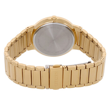 Gold-tone stainless steel case and bracelet. Fixed gold-tone stainless steel bezel. Champagne dial with gold-tone hands and crystal hour markers. Dial Type: Analog. Date display at the 6 o'clock position. Citizen Caliber G111 quartz movement. Pull / push crown. Solid case back. Round case shape, case size: 40 mm, case thickness: 7.2 mm. Band width: 22 mm. Fold over clasp with a safety release. Water resistant at 50 meters / 165 feet. Functions: date, hour, minute, second. Casual watch style. Watch label: Japan Movt. Citizen Quartz Crystal Champagne Dial Men's Watch BI5012-53Q.