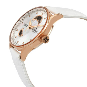 Rose gold PVD stainless steel case with a white leather strap. Fixed rose gold PVD bezel. White mother of pearl (open heart) dial with rose gold-tone hands and index hour markers. Minute markers around the outer rim. Dial Type: Analog. Edox calibre 85 automatic movement, containing 25 Jewels, bitting at 28800 vph, and has a power reserve of approximately 42 hours. Scratch resistant sapphire crystal. Pull / push crown. Transparent case back. Round case shape. Case size: 37 mm. Case thickness: 9.5 mm. Band width: 19 mm. Tang clasp. Water resistant at 50 meters / 165 feet. Functions: hour, minute, second. Les Vauberts Open Heart Series. Dress watch style. Watch label: Swiss Made. Edox Les Vauberts Open Heart White Mother of Pearl Dial Automatic Ladies Watch 85019 37RA NADR.
