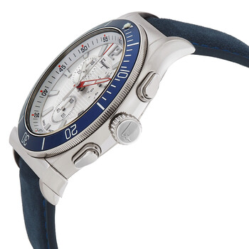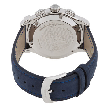Silver-tone stainless steel case with a blue leather strap. Uni-directional rotating blue stainless steel bezel. White dial with silver-tone hands and index-Arabic numeral hour markers. Dial Type: Analog. Luminescent hands and markers. Date display at the 4 o'clock position. Quartz movement. Scratch resistant sapphire crystal. Pull / push crown. Solid case back. Round case shape, case size: 44 mm, case thickness: 12.25 mm. Band width: 22 mm. Tang clasp. Water resistant at 100 meters / 330 feet. Functions: chronograph, date, hour, minute, second. 1898 Sport Chrono Series. Sport watch style. Watch label: Swiss Made. Ferragamo 1898 Sport Chrono Quartz White Dial Men's Watch SFYL01322.