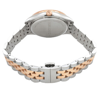 Silver-tone stainless steel case with a two-tone (silver-tone and rose gold-tone) stainless steel bracelet. Fixed rose gold-tone stainless steel bezel. Silver dial with rose gold-tone hands and index hour markers. Double gancini at the 8 o'clock position. Minute markers around the outer rim. Dial Type: Analog. Quartz movement. Scratch resistant sapphire crystal. Pull / push crown. Solid case back. Round case shape, case size: 38 mm. Deployment clasp. Water resistant at 50 meters / 165 feet. Functions: hour, minute, second. New Lady Series. Dress watch style. Watch label: Swiss Made. Ferragamo New Lady Quartz Silver Dial Two-Tone Watch SFU100323.
