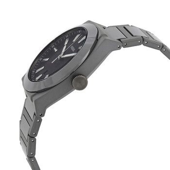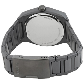 Grey ceramic case and bracelet. Fixed grey ceramic bezel. Black dial with silver-tone hands and index hour markers. Arabic numeral minute markers (at 5 minute intervals) around the outer rim. Dial Type: Analog. Luminescent hands and markers. Date display at the 6 o'clock position. Quartz movement. Scratch resistant mineral crystal. Pull / push crown. Solid case back. Round case shape, case size: 42 mm. Band width: 18 mm. Fold over clasp with a safety release. Water resistant at 50 meters / 165 feet. Functions: date, hour, minute, second. Everett Series. Casual watch style. Fossil Everett Quartz Black Dial Men's Watch CE5027.