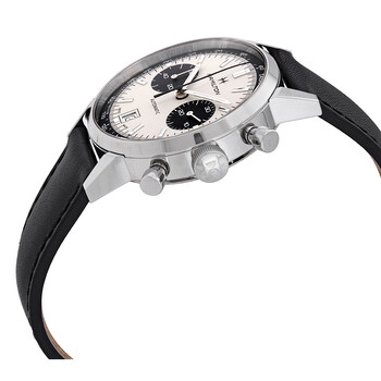 Stainless steel case with a black (calfskin) leather strap. Fixed stainless steel bezel. White dial with luminous silver-tone hands and index hour markers. Minute markers. Tachymeter markings around the outer rim. Dial Type: Analog. Luminescent hands and markers. Date display at the 6 o'clock position. Chronograph - two black sub-dials displaying: 60 second and 30 minute. Hamilton calibre H-31 automatic movement, based upon ETA 7753, containing 27 Jewels, bitting at 28800 vph, and has a power reserve of approximately 60 hours. Scratch resistant sapphire crystal. Solid case back. Round case shape. Case size: 40 mm. Case thickness: 14.45 mm. Band width: 20 mm. Tang clasp. Water resistant at 100 meters / 330 feet. Functions: chronograph, tachymeter, date, hour, minute, second. Intra-matic Series. Casual watch style. Watch label: Swiss Made. Hamilton Intra-Matic Automatic Chronograph Men's Watch H38416711.