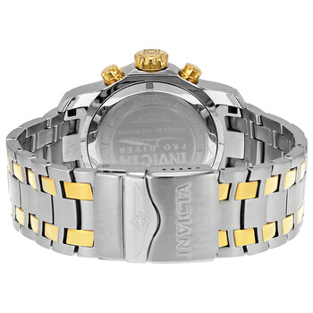 Stainless steel case with a two-tone (silver-tone and18kt gold-plated) stainless steel bracelet. Uni-directional rotating 18kt gold-plated bezel with a blue top ring. Blue dial with skeleton gold-tone sword-shaped hands and dot hour markers. Minute markers around the outer rim. Dial Type: Analog. Luminescent hands and markers. Date display at the 4 o'clock position. Chronograph - three sub-dials displaying: 60 second, 30 minute and 12 hour. Ronda caliber 5030.D quartz movement. Scratch resistant Flame Fusion crystal. Pull / push crown. Solid case back. Round case shape. Case size: 48 mm. Case thickness: 17 mm. Band width: 26 mm. Band length: 8.5 inches. Fold over clasp with a safety release. Water resistant at 200 meters / 660 feet. Functions: chronograph, date, hour, minute, second. Pro Diver Series. Casual watch style. Watch label: Swiss Movt. Invicta Pro Diver Chronograph Blue Dial Men's Watch 0077.