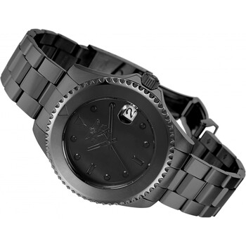 Black stainless steel case and bracelet. Uni-directional rotating silver-tone stainless steel bezel. Black dial with black hands and index hour markers. Dial Type: Analog. Date display at the 3 o'clock position. SII Caliber NH35A Automatic movement, containing 24 Jewels, bitting at 21600 vph, and has a power reserve of approximately 41 hours. Scratch resistant mineral crystal. Screw down crown. Transparent see through case back. Round case shape, case size: 38 mm, case thickness: 14 mm. Band width: 18 mm, band length: 7.75 inches. Fold over safety clasp. Water resistant at 200 meters / 660 feet. Functions: date, hour, minute, second. Pro Diver Series. Casual watch style. Watch label: Japan Movt. Invicta Pro Diver Date Automatic Black Dial Ladies Watch 35042.