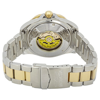 Stainless steel case with a two-tone (silver-tone and yellow gold-plated) stainless steel bracelet. Uni-directional rotating yellow gold-plated bezel with a blue (count-up elapsed time) ring. Blue dial with luminous yellow gold-tone arrow-shaped hands and dot hour markers. Minute markers around the outer rim. Dial Type: Analog. Luminescent tritnite hands and dial markers. Date display at the 3 o'clock position. SII caliber NH35A automatic movement, containing 24 Jewels, bitting at 21600 vph, and has a power reserve of approximately 41 hours. Scratch resistant mineral crystal. Screw down crown. Transparent case back. Round case shape. Case size: 47 mm. Case thickness: 16 mm. Band width: 22 mm, band length: 8.25 inches. Fold over clasp with a safety release. Water resistant at 300 meters / 1000 feet. Functions: date, hour, minute, second. Pro Diver Grand Diver Series. Dive watch style. Watch label: Japan Movt. Invicta Pro Diver Grand Diver Automatic Blue Dial Men's Watch 3049.