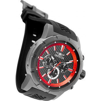 Black titanium case with a black silicone strap. Fixed black titanium bezel. Black and red dial with luminous grey hands and index hour markers. Minute markers around the outer rim. Dial Type: Analog. Luminescent hands and markers. Chronograph - three sub-dials displaying: 60 second, 60 minute and 24 hour. Quartz movement. Scratch resistant flame fusion crystal. Pull / push crown. Solid case back. Case diameter: 51 mm. Case thickness: 15 mm. Round case shape. Band width: 26 mm. Tang clasp. Water resistant at 100 meters / 330 feet. Functions: chronograph, GMT, hour, minute, second. Sport watch style. Invicta TI-22 Chronograph Black Dial Black Silicone Men's Watch 20452.