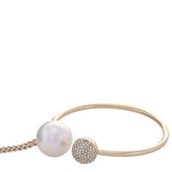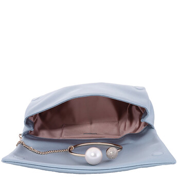 Jimmy Choo Ladies Clutch. SKU: J000164123-ICE BLUE/LIGHT GOLD. Color: Blue. Size: 10.6"W x 2"D x 5.5"H. Jimmy Choo Xandra Bangle Handle Clutch. This clutch features a bracelet chain handle with pave and imitation pearl details, a magnetic flap closure, an interior slip pocket, and polished gold-tone hardware. Material: Fabric/brass/plastic/crystal. Made in Italy.