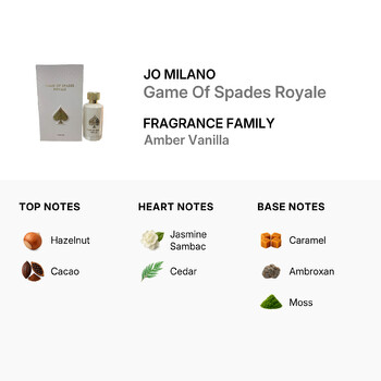 Fragrance Family: Amber Vanilla. Top notes: Hazelnut, Cacao. Heart notes: Jasmine sambac, Cedar. Base notes: Caramel, Ambroxan, Moss. Design house: Jo Milano. Design house category: niche fragrance brand. Design house country: United States. Scent name: Game Of Spades Royale. Gender: Unisex. Category: Fragrance. Collection: Parfum. SubType: Parfum Spray. Size: 3.4 oz. Barcode: 860009248670. Jo Milano Unisex Game Of Spades Royale Parfum 3.4 oz Fragrances 860009248670.