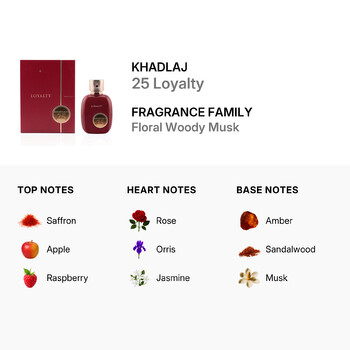 Fragrance Family: Floral Woody Musk. Top notes: Saffron, Apple, Raspberry. Heart notes: Rose, Orris, Jasmine. Base notes: Amber, Sandalwood, Musk. Design house: Khadlaj. Design house category: middle eastern fragrance. Scent name: 25 Loyalty. Gender: Ladies. Category: Fragrance. SubType: EDP Spray. Size: 3.4 oz. Barcode: 6291107975382. Khadlaj Ladies 25 Loyalty EDP Spray 3.4 oz Fragrances 6291107975382.