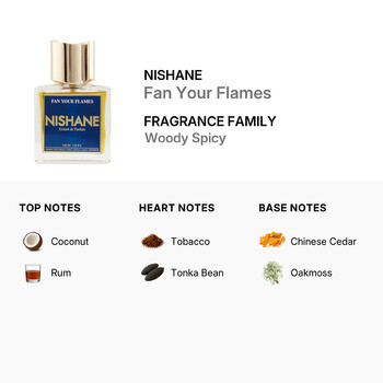 Launch year: 2017. Fragrance Family: Woody Spicy. Top notes: Coconut, Rum. Heart notes: Tobacco, Tonka bean. Base notes: Chinese cedar, Oakmoss. Design house: Nishane. Design house category: niche fragrance brand. Scent name: Fan Your Flames. Gender: Mens. Category: Fragrance. SubType: ExDP Spray. Size: 1.7 oz. Barcode: 8681008055579. Nishane Men's Fan Your Flames Extrait de Parfum Spray 1.7 oz Fragrances 8681008055579.