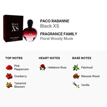 Launch year: 2007. Top notes: Pink peppercorn, Cranberry, Tamarind blossom. Heart notes: Hellebore rose. Base notes: Patchouli, Massoia wood, Vanilla. Design house: Paco Rabanne. Scent name: Black XS. Gender: Ladies. Category: Perfume. SubType: EDP Spray. Size: 2.7 oz. Barcode: 3349668555062. Paco Rabanne Ladies Black XS EDP Spray 2.7 oz Fragrances 3349668555062.
