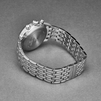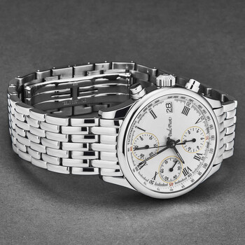 Silver-tone stainless steel case and bracelet. Fixed silver-tone stainless steel bezel. White dial with black hands and Roman numeral hour markers. Minute markers around the outer rim. Dial Type: Analog. Date display at the 3 o'clock position. Chronograph - three sub-dials displaying: 60 second, 30 minute and 12 hour. ETA-Valjoux Caliber 7750 Automatic movement, containing 25 Jewels, bitting at 28800 vph, and has a power reserve of approximately 44 hours. Scratch resistant sapphire crystal. Pull / push crown. Solid case back. Round case shape, case size: 36 mm, case thickness: 14 mm. Band width: 18 mm, band length: 8 inches. Fold over clasp with a safety release. Water resistant at 30 meters / 100 feet. Functions: chronograph, date, day, hour, minute, second. Additional Info: hours, minutes, small seconds, date, chronograph, tachymeter track. Telemark Series. Luxury watch style. Watch label: Swiss Made. Paul Picot Telemark Chronograph Automatic White Dial Men's Watch P4102.20.113/B.