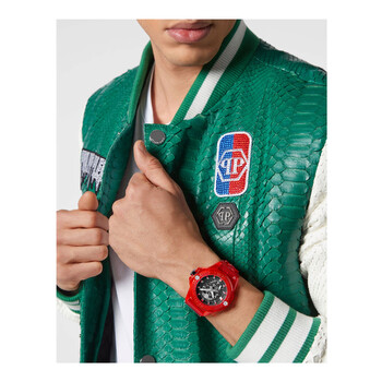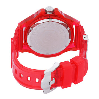 Red transparent resin case with a red transparent silicone strap. Fixed red transparent resin bezel. Black dial with silver-tone hands and index hour markers. Minute markers around the outer rim. Dial Type: Analog. Quartz movement. Scratch resistant mineral crystal. Pull / push crown. Solid case back. Round case shape, case size: 44 mm, case thickness: 14 mm. Tang clasp. Water resistant at 50 meters / 165 feet. Functions: hour, minute, second. The Skull Series. Sport watch style. Philipp Plein The Skull Quartz Black Dial Men's Watch PWWAA0223.