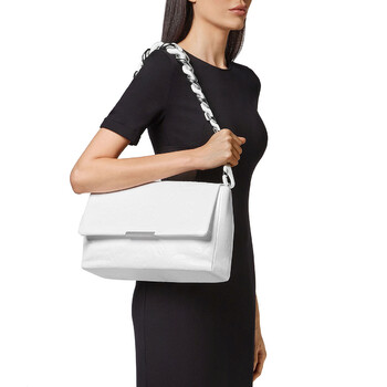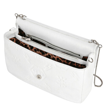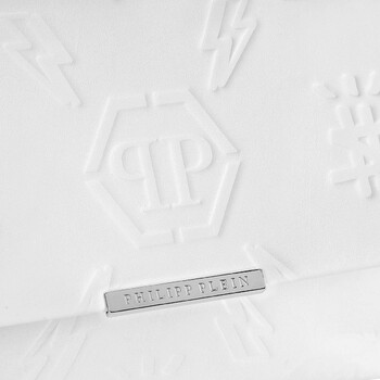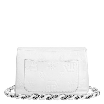 Philipp Plein Ladies Shoulder Bag. SKU: PAAA-WBA1362-PLE075N-01. Color: White. This nappa leather bag features an embossed monogram pattern throughout, complemented by a thick chain shoulder strap made of resin and metal. It includes a magnetic-closure flap and is lined with dappled fabric. The bag measures 33 cm in length, 20 cm in height, and 10 cm in width. . Shell: 100% Calf Leather; Lining: 100% Polyester; Filling: 50% Polyurethane 50% Polyamide; Insert: 50% Acrylonitrile Butadiene Styrene (Abs) 45% Poly(Methyl Methacrylate) (Pmma) 5% Stainless Steel. Made in Italy.