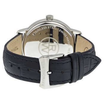 Stainless steel case with a black leather strap. Fixed stainless steel bezel. Black dial with silver-tone hands and index hour markers. Minute markers around the outer rim. Dial Type: Analog. Date display at the 3 o'clock position. Quartz movement. Scratch resistant sapphire crystal. Pull / push crown. Solid case back. Case diameter: 39 mm. Case thickness: 8 mm. Round case shape. Band width: 18 mm. Band length: 8.5 inches. Tang clasp. Water resistant at 50 meters / 165 feet. Functions: date, hour, minute, second. Casual watch style. Raymond Weil Toccata Black Dial Black Leather Men's Watch RW-5488-STC-20001.