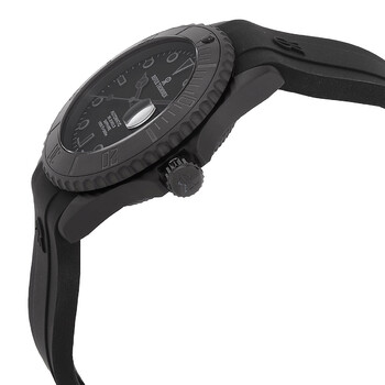 Black stainless steel case with a black rubber strap. Uni-directional rotating black stainless steel bezel. Black dial with black hands and index hour markers. Minute markers around the outer rim. Dial Type: Analog. Luminescent hands and markers. Date display at the 3 o'clock position. Sellita Caliber SW200 Automatic movement, containing 26 Jewels, bitting at 28800 vph, and has a power reserve of approximately 38 hours. Scratch resistant sapphire crystal. Screw down crown. Solid case back. Round case shape, case size: 42 mm, case thickness: 13 mm. Band width: 22 mm, band length: 8 inches. Fold over clasp with a safety release. Water resistant at 300 meters / 1000 feet. Functions: date, hour, minute, second. Additional Info: hours, minutes, seconds, date. Diver Series. Dive watch style. Watch label: Swiss Made. Revue Thommen Diver Automatic Black Dial Men's Watch 17571.2777.