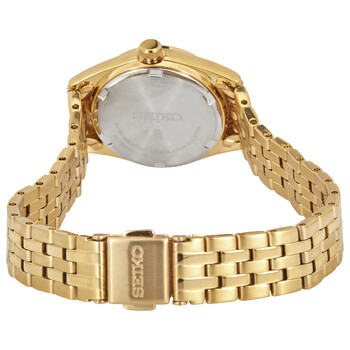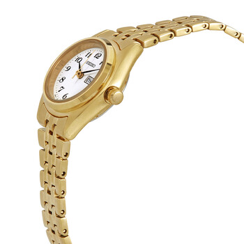 Gold-tone stainless steel case and bracelet. Fixed gold-tone bezel. White dial with black hands and Arabic numeral hour markers. Minute markers around the outer rim. Dial Type: Analog. Day of the week and date display at the 3 o'clock position. Quartz movement. Scratch resistant Hardlex crystal. Pull / push crown. Solid case back. Round case shape. Case size: 25.5 mm. Case thickness: 8.57 mm. Fold over clasp with a safety release. Water resistant at 100 meters / 330 feet. Functions: date, day, hour, minute, second. Essential Series. Casual watch style. Watch label: Japan Movt. Seiko Essential Quartz White Dial Ladies Watch SUR440.