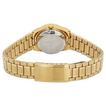 Yellow gold-tone stainless steel case and bracelet. Fixed yellow gold-tone bezel. Gold dial with luminous yellow gold-tone hands and index hour markers. Minute markers around the outer rim. Dial Type: Analog. Luminescent hands and markers. Day of the week and date display at the 3 o'clock position. Seiko caliber 4207 automatic movement, containing 21 Jewels, bitting at 21600 vph, and has a power reserve of approximately 24 hours. Scratch resistant Hardlex crystal. Pull / push crown. Solid case back. Round case shape. Case size: 24 mm. Case thickness: 10 mm. Band width: 13 mm. Fold over clasp with a safety release. Water resistant at 30 meters / 100 feet. Functions: date, day, hour, minute, second. Series 5 Series. Casual watch style. Seiko Series 5 Automatic Gold Dial Ladies Watch SYM600.