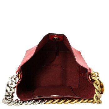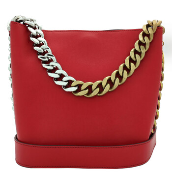 Stella Mccartney Ladies Crossbody. SKU: 7B0033 W8839-6309. Color: Bright Red. Size: 16. 5cm x 12cm x 20cm. Stella Mccartney Frayme Bucket Bag. ntroducing a fresh rendition of the iconic Frayme bag, showcasing an oversized version of the classic diamond-cut Falabella chain in both silver and gold. Crafted from the brand's sustainable Alter Mat vegan leather, it underscores a commitment to creating durable and eco-conscious accessories. Material: 51% polyester, 49% polyurethane. Made in Italy.