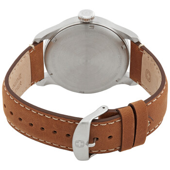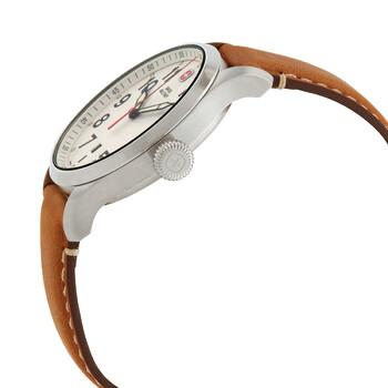Silver-tone stainless steel case with a brown leather strap. Fixed silver-tone stainless steel bezel. White dial with black hands and Arabic numeral hour markers. Arabic numeral minute markers (at 5 minute intervals). Dial Type: Analog. Luminescent hands and markers. Date display at the 6 o'clock position. Ronda Caliber 515 quartz movement. Scratch resistant sapphire crystal. Pull / push crown. Solid case back. Round case shape, case size: 42 mm. Tang clasp. Water resistant at 100 meters / 330 feet. Functions: date, hour, minute, second. Terragraph Series. Military watch style. Watch label: Swiss Movt. Swiss Military Terragraph Quartz White Dial Men's Watch 01.9041.302C.