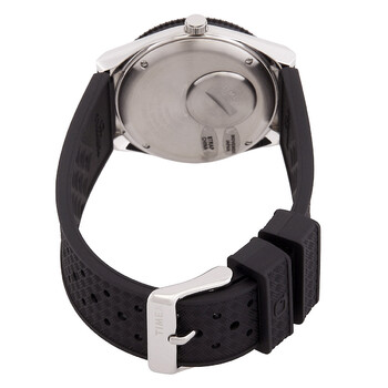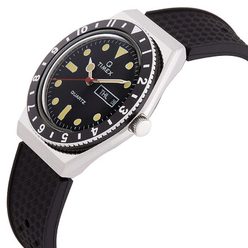 Silver-tone stainless steel case with a black synthetic rubber strap. Fixed black stainless steel bezel. Black dial with silver-tone hands and index hour markers. Minute markers around the outer rim. Dial Type: Analog. Day of the week and date display at the 3 o'clock position. Quartz movement. Scratch resistant acrylic crystal. Pull / push crown. Solid case back. Round case shape, case size: 38 mm, case thickness: 11.5 mm. Band width: 18 mm. Buckle clasp. Water resistant at 50 meters / 165 feet. Functions: date, day, hour, minute, second. Q Timex Series. Sport watch style. Item Variations: TW2V32000ZV. Timex Q Timex Quartz Black Dial Men's Watch TW2V32000.