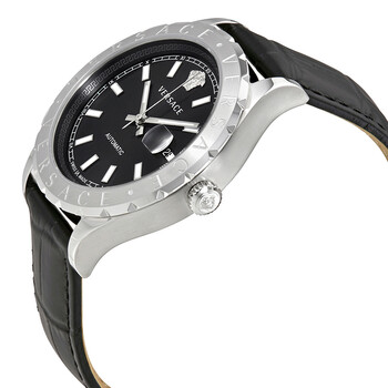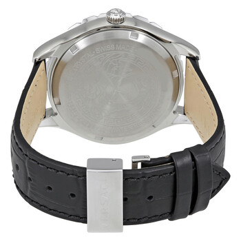 Silver-tone stainless steel case with a black leather strap. Fixed silver-tone stainless steel bezel. Black dial with silver-tone hands and index hour markers. Dial Type: Analog. Luminescent hands and markers. Date display at the 3 o'clock position. Automatic movement. Scratch resistant sapphire crystal. Case size: 42 mm. Case thickness: 10.60 mm. Round case shape. Band width: 20 mm. Water resistant at 50 meters / 165 feet. Functions: date, hour, minute, second. Dress watch style. Watch label: Swiss Made. Versace Hellenyium Black Dial Men's Leather Watch VZI010017.