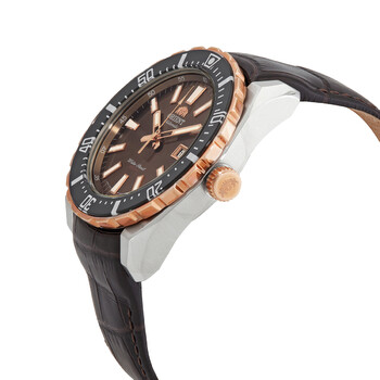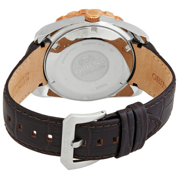Silver-tone stainless steel case with a brown leather strap. Uni-directional rotating rose gold-tone stainless steel bezel with an inlaid black ring. Brown dial with rose gold-tone hands and index hour markers. Arabic numeral minute markers (at 5 minute intervals). Minute markers around the outer rim. Dial Type: Analog. Luminescent hands and markers. Date display at the 3 o'clock position. Orient Calibre F6722 Automatic movement, containing 22 Jewels, bitting at 21600 vph, and has a power reserve of approximately 40 hours. Scratch resistant mineral crystal. Screw down crown. Round case shape, case size: 46 mm, case thickness: 12.5 mm. Band width: 24.5 mm. Tang clasp. Water resistant at 200 meters / 660 feet. Functions: date, hour, minute, second. Sport watch style. Watch label: Japan Movt. Orient Automatic Brown Dial Men's Watch FAC09002T0.