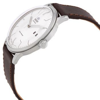 Silver-tone stainless steel case with a brown leather strap. Fixed silver-tone stainless steel bezel. White dial with silver-tone hands and index hour markers. Minute markers around the outer rim. Dial Type: Analog. Date display at the 3 o'clock position. Orient Calibre F6724 automatic movement with a 40-hour power reserve. Scratch resistant mineral crystal. Pull / push crown. Solid case back. Round case shape, case size: 40.5 mm. Buckle clasp. Water resistant at 30 meters / 100 feet. Functions: date, hour, minute, second. Casual watch style. Watch label: Japan Movt. Orient Automatic White Dial Men's Watch FAC0000EW.