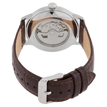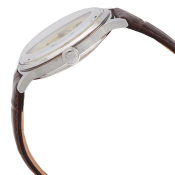 Silver-tone stainless steel case with a brown leather strap. Fixed silver-tone stainless steel bezel. Beige dial with silver-tone hands and index and Arabic numeral markers at the 3,6,9 and 12 o' clock positions hour markers. Arabic numerals appear at the 3, 6, 9 and 12 o'clock positions. Minute markers around the outer rim. Dial Type: Analog. Date display at the 3 o'clock position. One subdial displaying: small second. Orient Calibre F6222 Automatic movement, containing 24 Jewels, bitting at 21600 vph, and has a power reserve of approximately 40 hours. Scratch resistant mineral crystal. Pull / push crown. Transparent see through case back. Round case shape, case size: 40 mm, case thickness: 12 mm. Band width: 21 mm. Buckle clasp. Water resistant at 30 meters / 100 feet. Functions: date, hour, minute, small second. Bambino Series. Dress watch style. Watch label: Japan Movt. Orient Bambino Automatic Beige Dial Men's Watch RAAP0003S10B.