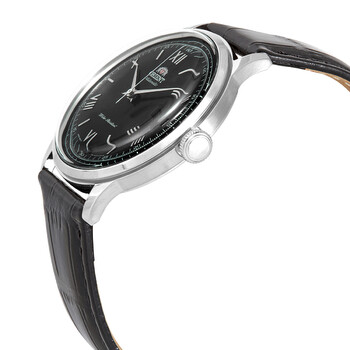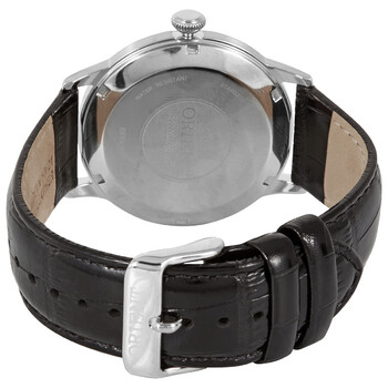 Stainless steel case with a black leather strap. Fixed stainless steel bezel. Black dial with silver-tone hands and alternating Roman numeral and index hour markers. Arabic numeral minute markers (at 5 minute intervals). Minute markers around the outer rim. Date display at the 3 o'clock position. Orient caliber F67 automatic movement with a 40-hour power reserve. Scratch resistant mineral crystal. Pull / push crown. Solid case back. Round case shape. Case size: 46.5 mm. Case thickness: 11.8 mm. Strap width: 21 mm. Tang clasp. Water resistant at 30 meters / 100 feet. Functions: date, hour, minute, second. Bambino Series. Casual watch style. Watch label: Japan Movt. Orient Bambino Automatic Black Dial Men's Watch FAC0000AB.