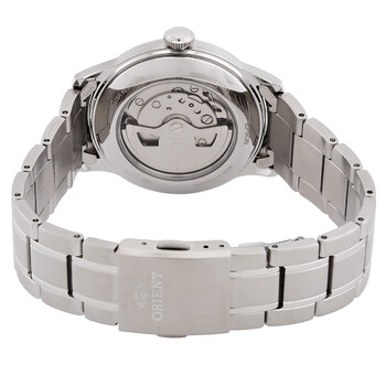Silver-tone stainless steel case with a blue stainless steel bracelet. Fixed silver-tone stainless steel bezel. Blue dial with silver-tone hands and index hour markers. Minute markers around the outer rim. Dial Type: Analog. Date display at the 3 o'clock position. Orient Calibre F6724 automatic movement with a 40-hour power reserve. Scratch resistant mineral crystal. Pull / push crown. Transparent case back. Round case shape, case size: 38.4 mm, case thickness: 12.5 mm. Band width: 20 mm. Fold over clasp with a safety release. Water resistant at 30 meters / 100 feet. Functions: date, hour, minute, second. Bambino Series. Casual watch style. Watch label: Japan Movt. Orient Bambino Automatic Blue Dial Watch RA-AC0M10L.