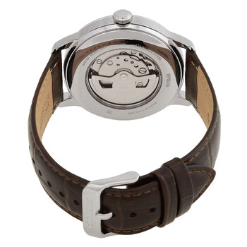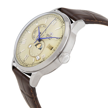 Silver-tone stainless steel case with a brown leather strap. Fixed silver-tone stainless steel bezel. Beige dial with blued hands and Roman numeral hour markers. Minute scale around the inner rim. Dial Type: Analog. Date display at the 3 o'clock position. Two-day of the week and sun/moon phase subdials. Orient Calibre F6B24 Automatic movement, containing 22 Jewels, bitting at 21600 vph, and has a power reserve of approximately 40 hours. Scratch resistant mineral crystal. Pull / push crown. Transparent see through case back. Round case shape, case size: 41.5 mm, case thickness: 14 mm. Band width: 21 mm. Buckle clasp. Water resistant at 30 meters / 100 feet. Functions: date, hour, minute, second. Bambino Series. Sport watch style. Watch label: Japan Movt. Item Variations: RA-AK0803. Orient Bambino Automatic Men's Watch RA-AK0803Y.