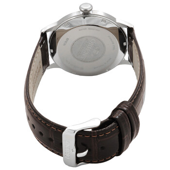 Silver-tone stainless steel case with a leather strap. Fixed silver-tone stainless steel bezel. White dial with blue hands and index-Roman numeral hour markers. Minute markers around the outer rim. Dial Type: Analog. Date display at the 3 o'clock position. Orient Calibre F6724 automatic movement with a 40-hour power reserve. Scratch resistant mineral crystal. Pull / push crown. Solid case back. Round case shape, case size: 40.5 mm, case thickness: 11.8 mm. Band width: 21 mm. Buckle clasp. Water resistant at 30 meters / 100 feet. Functions: date, hour, minute, second. Bambino Series. Casual watch style. Watch label: Japan Movt. Item Variations: TAC00009W0. Orient Bambino Automatic Version 2 White Dial Watch TAC00009W.